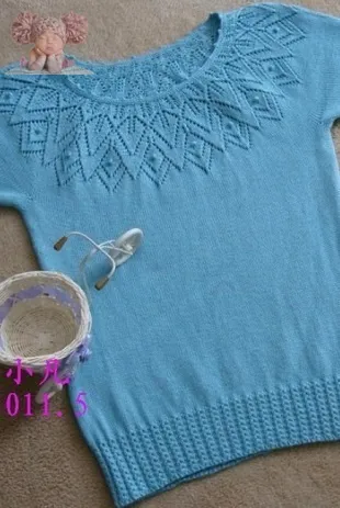 Пуловеры с круглой кокеткой пользуются заслуженной популярностью у рукодельниц. Причем это касается, как изделий связанных крючком, так и изделий, связанных спицами. Изделия, связанные круглой кокеткой, выглядят особенно нежно и изысканно. Круглая ажурная кокетка, украшена перламутровыми бусинами, в цвет пряжи. Остальную часть пуловера, можно связать простым узором, так как весь акцент и все внимание будет ажурную круглую кокетку. Далее - схема вязания круглой кокетки спицами.