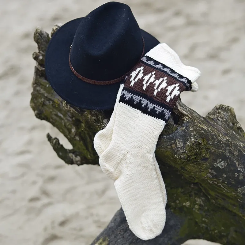 Носки с орнаментом в белоснежном исполнении легко становятся новогодним подарком, которому будут рады и мужчины — достаточно подогнать длину стопы по размеру.