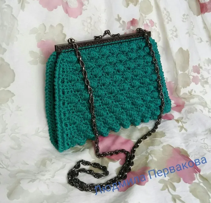 Сумочка с фермуаром на цепочке, изумрудного цвета. Моя работа. Связана крючком. Пряжа хлопок. Размер высота 17 см, ширина 23 см, сбоку ширина 4 см.