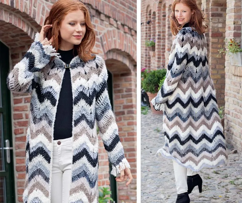 Эффектный зубчатый узор пальто слегка поблескивает благодаря пайеткам и мерцающим нитям, спрятанным в нитях. Всего для пальто использованы семь различных видов пряжи!