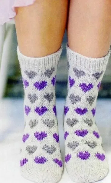 Вяжите на всех 60(72) п. вкруговую основным узором, вывязывая клин подъема стопы по общим правилам вязания носка. Когда на спицах останется 50(60) п., вяжите без убавлений 16-19 см 4(5) сердечек от пятки). После этого вяжите светло-серой нитью до длины 16(20) см.