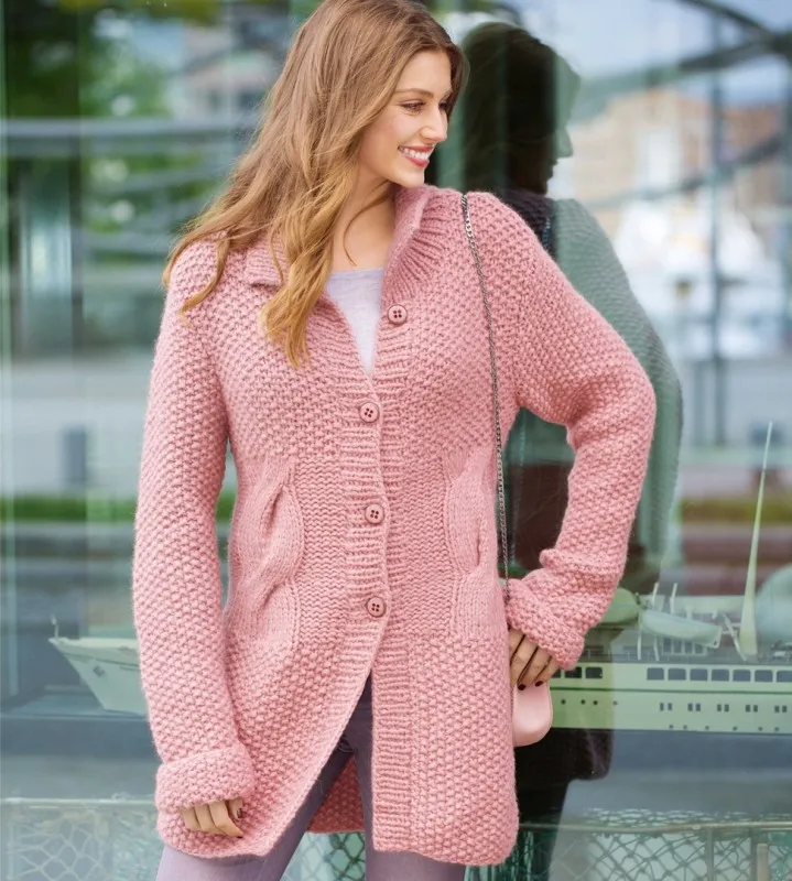 Пряжа (70% шерсти альпака, 20% полиамида, 10% овечьей шерсти; 65 м/50 г) — 750 (800) 850 (900) г розовой; спицы №8 и 9; 4 пуговицы.