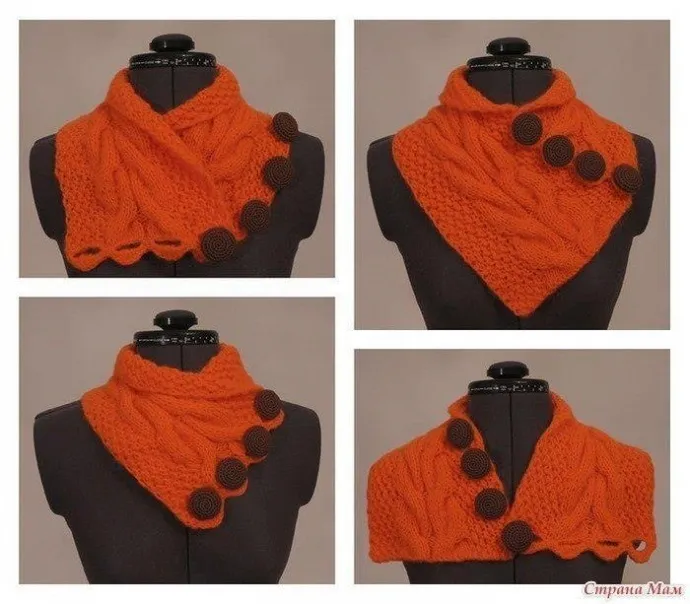 Как видите, сам шарфик простой. А вся фишка в 4 варианта застежки - можно потеплее застегнуться, а можно просто, как воротничок одеть.