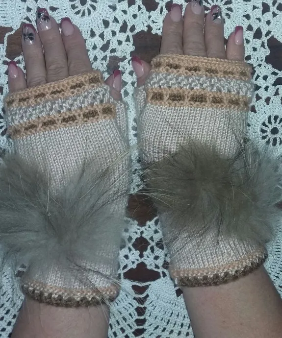 Пряжа Brilliant 45% шерсь [ ластер] и 55% акрил 380/100г. Бежевый цвет очень красивый, немного с блеском. Помпоны из меха.