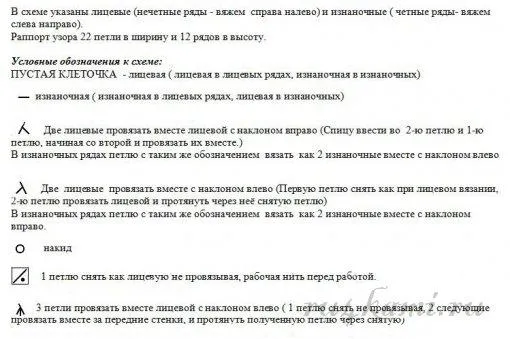 1-й ряд: *(2 вместе лиц.) – 6 раз, (накид, 1 изн.) – 6 раз, повторять от *. 2-й ряд: лиц. петли. 3-й ряд: изн. петли. 4-й ряд: лиц. петли. 5-8 ряды: повторить 1-4 ряды. 9-11 ряды: повторить 1-3 ряды.П...