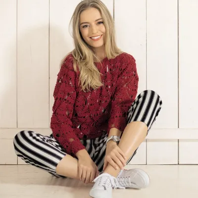 Короткий джемпер прямого покроя из благородной шерсти с кашемиром вяжется сверху вниз крупным ажурным узором.