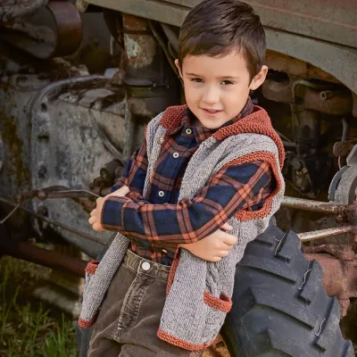 Пряжа (50% шерсти яка, 50% мериносовой шерсти экстрафайн; 130 м/50 г) — 200 (250-300) г светло-серой и 100 г коричнево-оранжевой; спицы №4 и 4,5; 5 роговых пуговиц диаметром 14 мм.