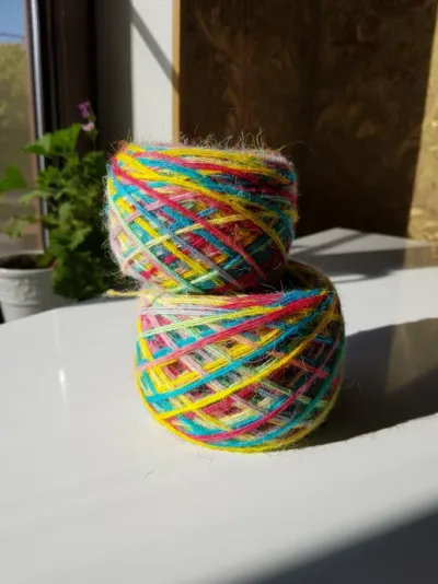 Окрашенная мною шерсть высушена и смотана. Уж очень нетерпелось попробовать ее в вязании. Связала маленький образец, и вот что у меня получилось...