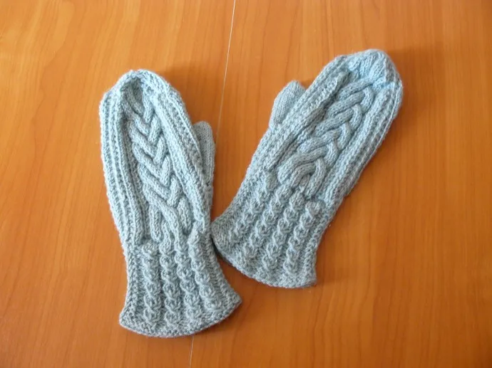 Первый опыт, первые варежки спицами. Тоже вязались в подарок маме на ДР. Сроки поджимали, опыта ноль, так что вязала "варварским" способом - на двух спицах, две половинки одной варежки, соединяла крючком. Вязала по видео МК на ютюбе, очень рисунок понравился, и резинки, и основной. Но ума, сил и терпения не хватило, чтобы подогнать нужное количество петель для вязания вкруговую.