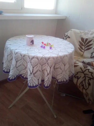 Думаю, что длинными зимними вечерами, дополню эту скатерть фиолетовыми салфетками. А весной буду наслаждаться кофе в своей уютной лоджии.