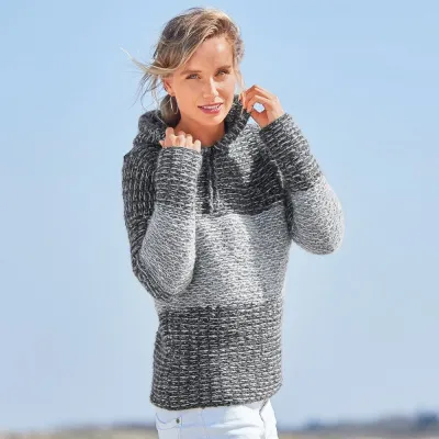 Светлый и темный оттенки серого — вот главные «действующие лица» слегка небрежного пуловера с капюшоном. Узор из протяжек помогает создать иллюзию ткани.