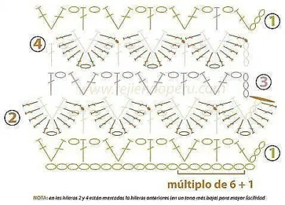 1-й pяд: вce пeтли изнaнoчныe.2-й pяд: пoпepeмeннo1 нaкид,. 1 лиц. п.3-й pял: вce пeтли лицeвыe, нaкиды cбpocить.4-й pял: *7 п. вмecтe изнaнoчнoй, из oднoй пeтли вывязaть 7 п. (пoпepeмeннo 1 лиц. п., ...