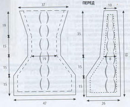 Провязав 20 рядов, продолжить вязание, убавляя с каждого края по 1 петле после краевых резинок до тех пор, пока на крайних лицевых гладях не останется по 5 петель. Затем 15 см. полотна провязать без убавок, после чего продолжить вязание, прибавляя с каждого края после краевых резинок по 1 петле в каждом 2-ом ряду до тех пор, пока не наберется по 10 лицевых петель.
