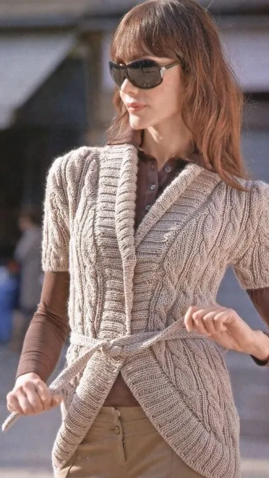 Сборка жакета: выполнить плечевые швы. Для планки полочек и горловины на спицы № 4 набрать по горловине спинки 44 п. и вязать резинкой 2/2, набирая с обеих сторон работы в каждом 2-м р. по горловине каждой полочки 5 х 6 п. и 6 х 5 п., затем набрать по центральному краю каждой полочки 1 х 74 п. и по наборному краю каждой полочки 1 х 24 п.; вновь набранные петли вязать резинкой 2/2 по рисунку, через 8 см (измеряя по самой короткой части) связать 4 р. двойной резинкой и закрыть все петли. При этом на высоте 5 см от начала планки, на средних 10 см центрального края правой полочки, выполнить 3 отверстия для пуговиц (2 п. вместе, 1 накид) с интервалом 5 см. Вшить рукава, выполнить швы рукавов и боковые швы. Пришить пуговицы, Для пояса на спицы № 4,5 набрать 9 п., связать 120 см двойной резинкой и закрыть все петли трикотажным швом. Для шлевок на спицы № 4,5 набрать 5 п., связать 8 см двойной резинкой и закрыть все петли трикотажным швом. Связать всего 2 шлевки и пришить их к боковым швам на расстоянии 20 см от нижней планки.
