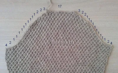 Для плавного закругленного оката сверху предпоследние закрытия петель сделаю, например, такими: 2,3,4. На это уйдет 6 рядов и по 9 петель с каждой стороны.