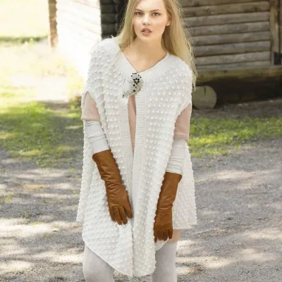 Просторная накидка связана узором из «шишечек», который не создает дополнительного объема благодаря использованию тонкой пряжи.