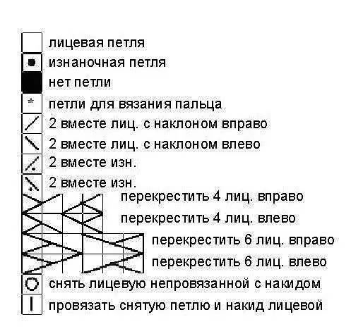 Набрать 52 петли и вязать по кругу 40 рядов резинкой 2×2. В последнем ряду резинки прибавить 2п. Далее вязать по схеме Палец начинается в 10м ряду, по бокам от 2х средних петель маленькой косички прибавляем - - в каждом втором ряду 3 раза - в каждом третьем ряду 3 раза - в каждом втором ряду 3-4 раза. Когда на спице для пальца образуется 18-20 петель, отложить его на булавки (петли пальца начинаются и заканчиваются петлями прибавок), набрать над ним недостающие 2 петли и вязать далее по схеме. Палец затем заканчиваем отдельно, набрав 2 петли Вяжем в высоту сколько нужно, но минус 1 см Дальше вяжем два ряда: - в первом вяжем попеременно 1 лиц и 2 вместе лиц. - во втором вяжем 2 вместе лиц. до конца ряда. Далее ниткой стянуть оставшиеся петли.