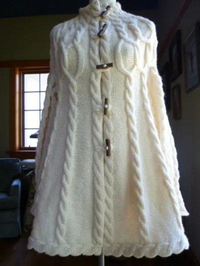 Очень красивое пальто! Ну наверное это круглой кокеткой сверху вяжется, по груди идёт отличающийся от основных кос рисунок, думаю или самостоятельно попробовать рассчитать, или поискать, к примеру, на аверчевой, или просто на просторах сети. Прибавки тут тех местах, где изнаночные между косами. Думаю ниточки не тоньше 400 м в 100 гр. плюс спицы тоже не толстые. rhondabuss.blogspot.com/2012/05/knitting-paradise.html