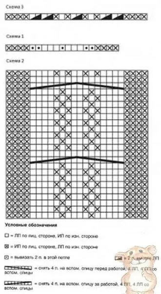 4,5. Узоры: по схемам № 1, № 2, № 3. Платочная вязка: лиц. и изн. ряды