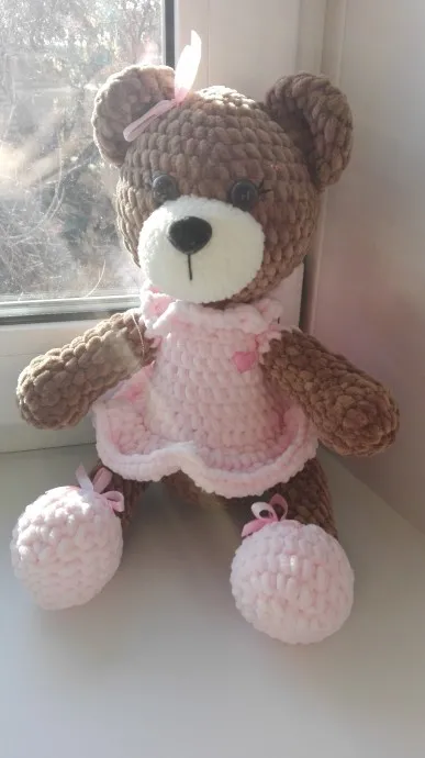 Мишутка. Связана на заказ для маленькой девочки. Пряжа коричневая Карпту, розовая ЯрнАрн. Набивка синтепух. Розовые ленточки.