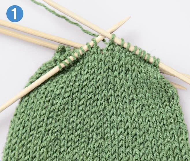 Затем вязать 2-й круговой ряд с убавками, провязывая вместе каждую 5-ю и 6-ю п. Теперь на спице между убавками осталось 4 п., т. е. далее выполнять 4 круговых ряда без убавок.