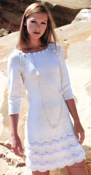 Платье связано без швов по кругу снизу вверх. Для того, чтоб избежать ошибок и связать изделие желаемого размер и силуэта необходимо перед началом работы сделать выкройку (на бумаге или плотной ткани в натуральную величину), учитывая индивидуальные особенности фигуры. Затем связать из той же пряжи образец 10 на 10 см для того, чтоб определить плотность вязания. Далее сделайте расчет вязания. И еще, даже если расчет с точки зрения теории выполнен правильно, не забывайте в процессе вязания, как можно чаще прикладывать полотно к выкройке для контроля и корректировки размеров изделия.
