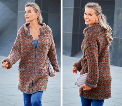 пряжа Cometa (34% шерсти альпака, 33% полиамида, 22% вискозы, 6% натуральной шерсти, 5% полиэстера; 130 м/50 г) — 250 (300) г серой и 200 (250) г цв. ржавчины; спицы №7 и 7,5; круговые спицы №7 и 7,5; крючок №6; разъемная застежка-молния антрацитового цвета длиной 70 (75) см.