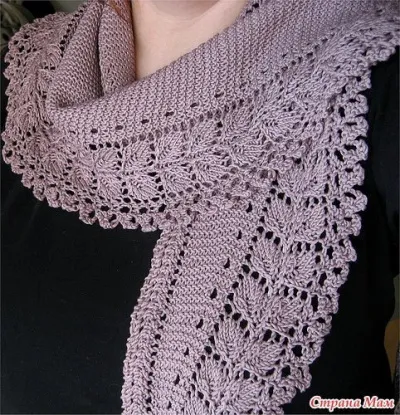 Продолжая вязать рисунок делать убавления в каждом шестом ряду еще 33 раза, таким образом сужая косынку, затем провязать ряд с убавлениями еще раз, заканчивая на пятом ряде схемы – 4 платочных петли между маркерами. Провязать ряды 6-8 схемы – 30 петель: 8 петель перед первым маркером, 4 платочных петли между маркерами, 18 петель после второго маркера. Провязано 496 рядов и 62 раппорта. Длина вязания должна быть около 180,5 см.