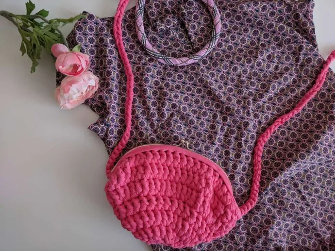 Всем привет! Я связала сумочку из трикотажной пряжи. Оставалось как раз немного. И фермуар пригодился.