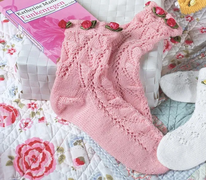 Пряжа (75% натуральной шерсти, 25% полиамида; 190 м/45 г + 5 г для отделки) – 100 г розовой; чулочные спицы № 2,5; 10 маленьких атласных розочек розового цвета диаметром по 30 мм.