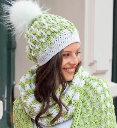 Двухцветный комплект из шапки с помпоном и снуда, связанный крючком рельефным узором, очень практичный и удобный и отлично спасает от холода.
