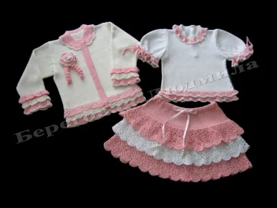 Нарядный комплект для девочки связан из хлопка. В комплект для девочки входят платье , кофточка и шляпка. Комплектацию комплекта для девочки можно изменить