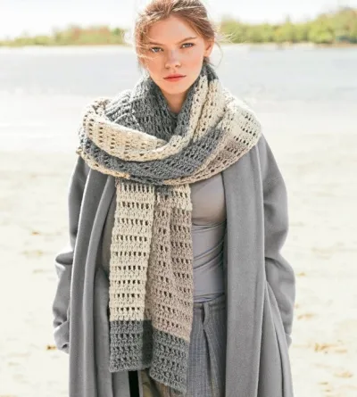 Пряжа (80% овечьей шерсти, 20% полиамида; 210 м/100 г) — 400 г натурально-белой, 300 г серой и 100 г бежевой; крючок №5.