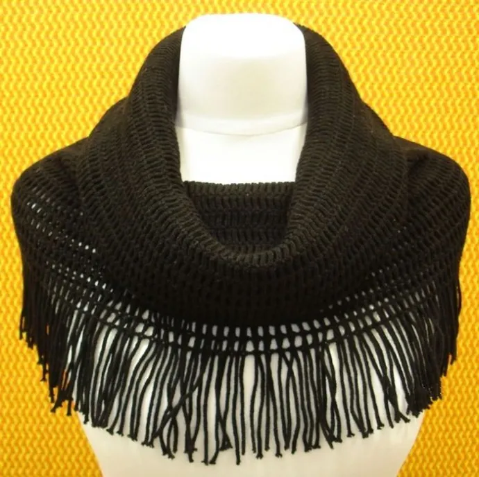 Мягкий ажурный белый снуд с бахромой заменит сразу три вещи - шарф, манишку, капюшон.