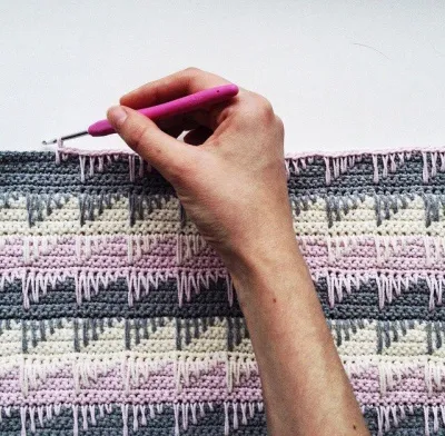 Весь узор вяжется простыми столбиками без накида. А в каждом первом ряду нового цвета столбики вяжем с протяжками вниз, цепляя нить за первый, второй, третий, четвертый, пятый и шестой ряды поочередно.