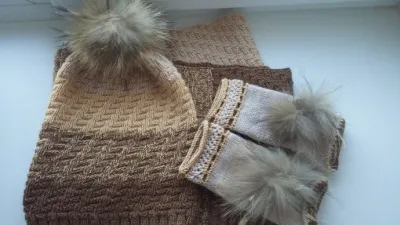 Хороший комплект получился, цветовая гамма подобрана со вкусом, узор интересный, связано аккуратно и ещё порадовало, что помпон на шапке из ИСКУССТВЕННОГО меха!!!