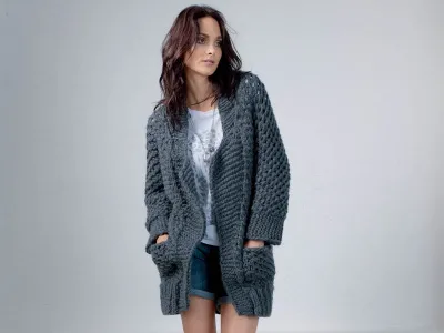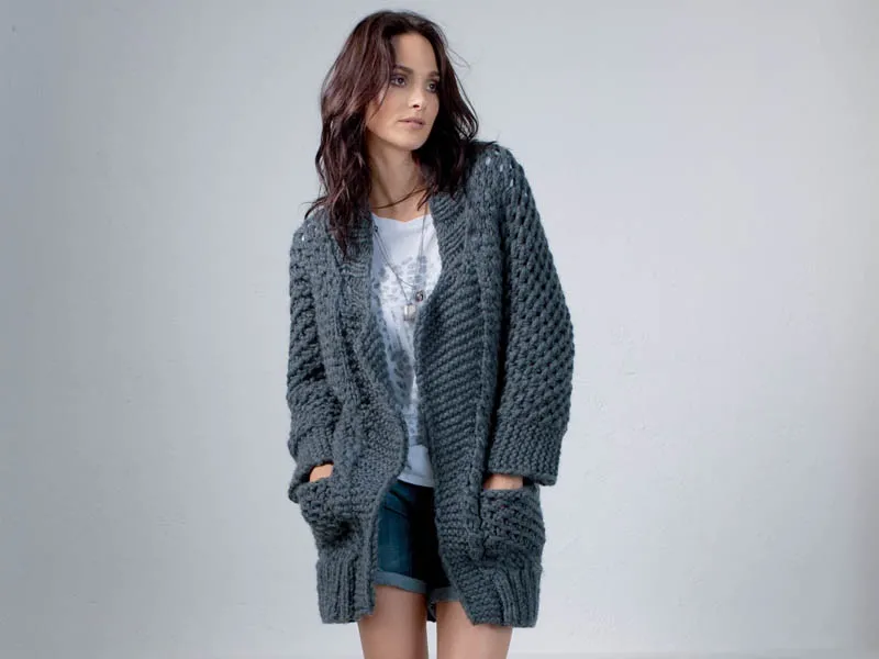 Кардиган с цельновязанными рукавами и накладными карманами не представляет особого труда в работе, зато отлично греет и очень стильно смотрится.