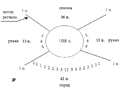Пусть регланная линия будет состоять из 1п. Т.к. регланных линии четыре, то 4*1п.= 4п. отводим для регланов. Осталось 108п.-4п.= 104п. Эти петли делим на 8 частей: 104п.:8 = 13п. По одной части берем на рукава(13п.) и по три части - на перед и спинку(13п.*3=39п.). Для себя все расчеты я отмечаю на схеме, получается более наглядно и понятно.