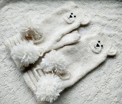 Варежки - мишки!Варежки связаны спицами из пушистой белой полушерстяной пряжи и изображают медвежат) Украшены интересными манжетами, завязками с бусинами и помпонами и, конечно, милыми медвежьими мордочками с ушками))) Заказывались в паре с мышатами(про таких же мышат есть уже отдельный пост ниже, поэтому их не стала фотографировать отдельно и выкладывать) здесь можно увидеть обе пары)