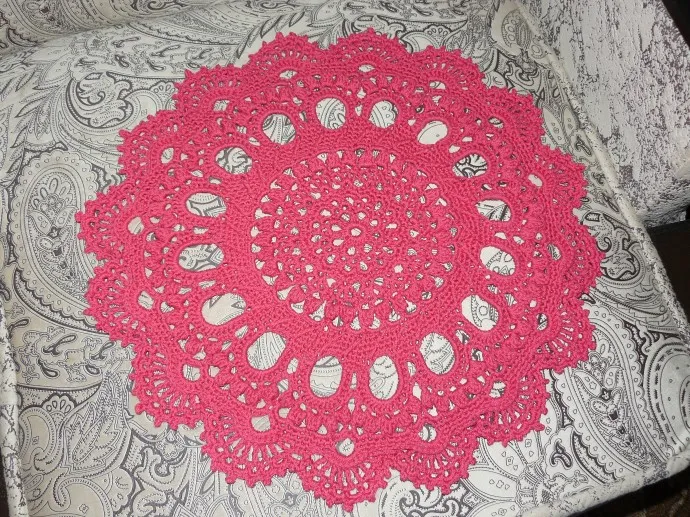Технические характеристики: диаметр 40 см, вес наверное примерно грамм 70. Очень бюджетные нитки из сети Fix Price - Флокс, 25 гр. 155 Текс 2 сл. Этими нитками связала уже 4 салфетки, все также рельефные, вот именно для рельефных мне очень нравятся. Крючок №5, вязала в 2 нити. Цвет мне сложно классифицировать. Не красный, не малиновый, не винный, не бордо... Пион что ли... Вобщем, точно не скажу. Наиболее близкий цвет получился на фото с рыжим хвостиком :)))))