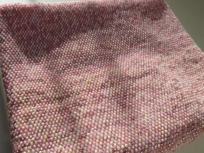 Закупка бисера происходила просто: зашла в местный рукодельный магазинчик, набрала 12 пакетиков по 5 граммов разных оттенков розового. Бисер Preciosa. Итого получилось 60 граммов. Нитки сначала купила не подходящие. Опытным путём поняла, что нужны тоньше. В итоге поисков нашла ниточки Pelican от Vita Cotton, 330 м в 50 гр. Первые, не подошедшие ниточки, купила белые. Пеликан уже купила розовенькие. Не могу найти этикеточку с цветом, к сожалению. В процессе вязания поняла, что на мои наполеоновские планы бисера не хватит. Пошла за такой же партией бисера. Также купила 12 пакетиков разных оттенков. Если на фото приглядеться, то заметно место, где закончилась первая партия бисера и началась новая. Но я не особо по этому поводу заморачиваюсь.