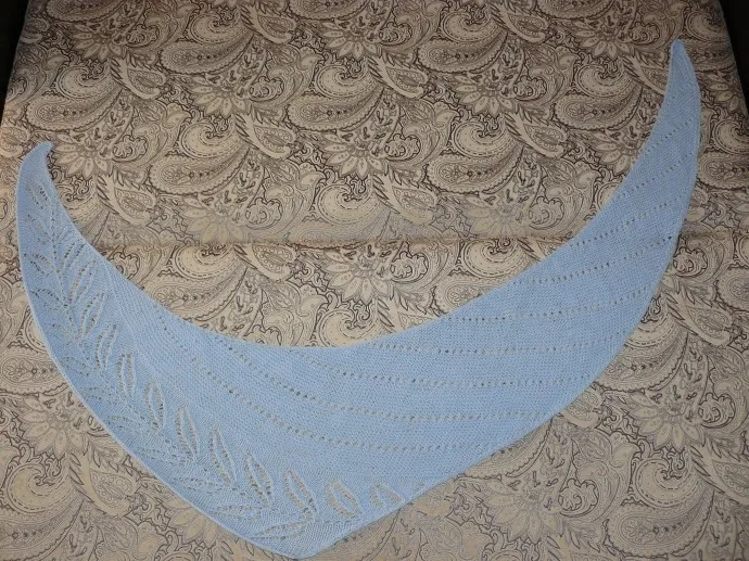 Характеристики: спицы №5, ниточки Пехорка Элитная Серия Австралийский меринос, 400 м в 100 гр, 95% мериносовой шерсти, 5% леакрила, цвет 195 Незабудка. Ушло примерно 120 грамм ниток, вязала в одну нить. Длина по верху 190 см, по углам 100 и 140 см, несимметричный немножко.