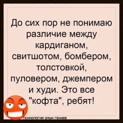 Боже, да что же вы так завелись то! Бог с вами! Все мы тут образованные! Вам пытаются сказать что терминология в этом случае не имеет особого значения! Я тоже работаю в интернет магазине уже семь лет! И в руках держала вещи и с названиями по круче! И да, должность моя мне не позволяет на работе называть худи — кофтой. Но дома для меня всё равно все кофты! Какое в этом преступление? Вы можете объяснить? Что ж вы тут нас посчитали за темный лес! И жили мы в достатке и голые не ходили!