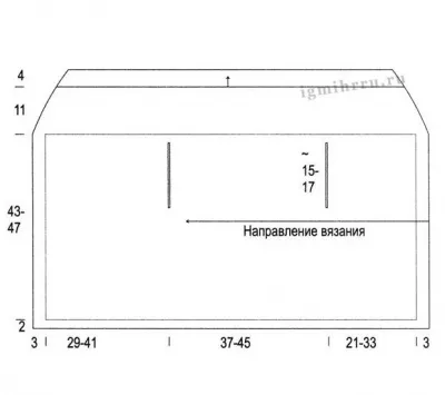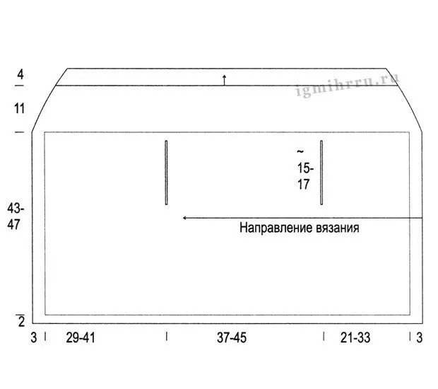 На спицы нитью в два сложения наберите 86(92) п., вяжите платочной вязкой 5 рядов. Далее вяжите следующим образом: вяжите 15 п. платочной вязки, 2 п. изн. глади, затем выполните 1 раппорт узора из кос (= 5 п. +1 п.), далее вяжите *5 (6) п. изн. глади, 1 раппорт узора из кос (= 5 п. + 1 п.)*, повторите *-* еще 5 раз, провяжите 1 п. изн. глади и 3 п. платочной вязки. После выполнения 1-го ряда узора из кос на спицах должно быть 93 (99) п. Далее повторяйте 2-9-й ряды схемы. После того, как 2-9-й ряды будут провязаны 4 (7) раз, провяжите еще раз 2-7-й ряды. В следующем 8-м (изнаночном) ряду вяжите 50 (61) п. по рисунку, закройте следующие 26 (28) п. для проймы и довяжите ряд до конца. В следующем лиц. ряду вяжите 17 п. по рисунку, затем наберите для проймы 25 (27) п. и вяжите ряд до конца. В следующем ряду (3-й ряд схемы) вяжите петли по рисунку, но 26 (28) п. проймы вяжите изн. Затем провяжите 4-9-й ряды схемы. Далее повторите 2-9-й ряды 7 (9) раз, затем провяжите еще раз 2-7-й ряды. В следующем 8-м (изнаночном) ряду вяжите 50 (61) п. по рисунку, закройте следующие 26 (28) п. для проймы и довяжите ряд до конца. В следующем лиц. ряду вяжите 17 п. по рисунку, затем наберите для проймы 25 (27) п. и вяжите ряд до конца. В следующем ряду (3-й ряд схемы) вяжите петли по рисунку, но 26 (28) п. проймы вяжите изн. Затем провяжите 4-9-й ряды схемы. Далее повторите 2-9-й ряды 6 (9) раз, затем провяжите еще 1 раз 2-4-й ряды, при этом в 4-м ряду в каждой косе убавьте по 1 п. = 86 (92) п. После этого провяжите 7 рядов платочной вязкой, при этом в 1-м ряду вывяжите 2 петли для пуговиц (третья петля будет располагаться на планке горловины) следующим образом: в лиц. ряду вяжите 6 лиц. п., выполните накид, провяжите 2 п. вместе лиц. протяжкой (= снимите 1 п. как лиц., провяжите 1 лиц. п. и протяните ее через снятую петлю), 6 лиц. п., накид, 2 п. вместе лиц. протяжкой, далее вяжите ряд до конца. Закройте петли как лиц.