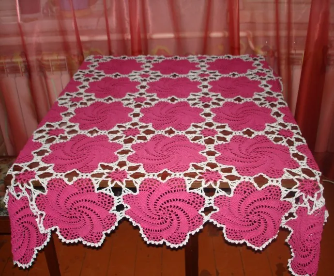 Очень мне понравилась Ваша скатерть. Сама хочу связать, правда круглую скатерть, у меня стеклянный стол на кухне круглый, вот пока ищу схему интересной скатерти.