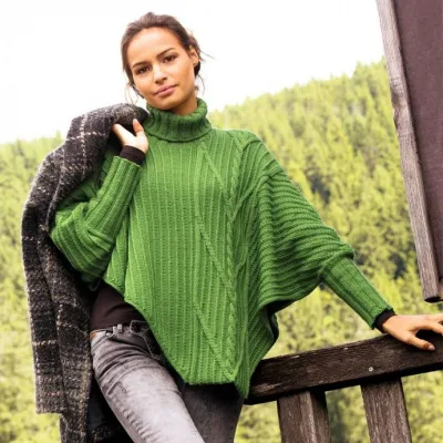 Необычный свитер-пончо с асимметричным силуэтом и смещенным узором из кос прекрасно сгладит недостатки фигуры, если они есть.