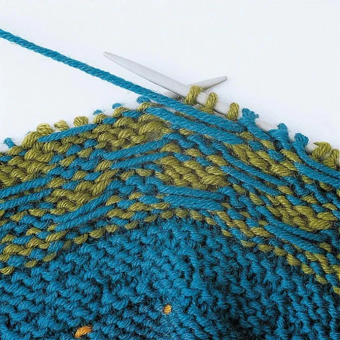 Каждый ряд в узорах с вытянутыми петлями вяжется нитью только одного цвета, при этом некоторые петли предыдущего ряда переснимаются и остаются непровязаными. Таким образом они вытягиваются в высоту на два и более рядов.
