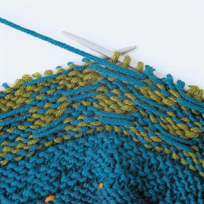 Каждый ряд выполняется нитью только одно цвета, эффект создается благодаря чередованию цветных рядов. Петли другого цвета предыдущего ряда переснимаются и оказываются поверх петель следующего ряда.