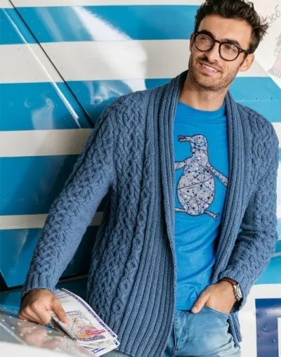 Кардиган без застежки, с потрясающим миксом арановых узоров и широкими планками, переходящими в шалевый воротник — идеальная модель для мужчин с хорошим вкусом.