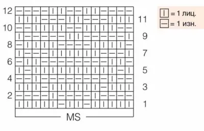 Вязать согласно схеме. На ней даны лицевые и изнаночные ряды. Начать с 1 кром., раппорт постоянно повторять, закончить 1 кром. 1–12-й ряды постоянно повторять.